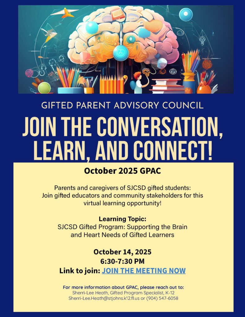 The Gifted Parent Advisory Council welcomes you! Our goal, as teachers and parents, is to ensure the gifted program in SJCSD provides the best possible educational experience for its students.