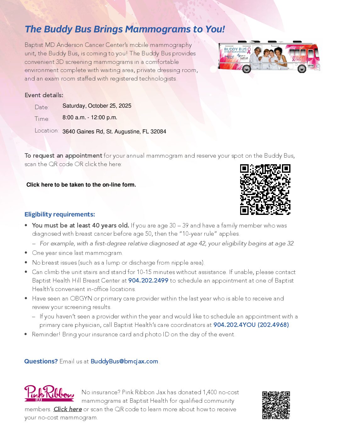 OneBlood’s “Big Red Bus” Bloodmobile and Baptist MD Anderson Cancer Center’s mobile mammography