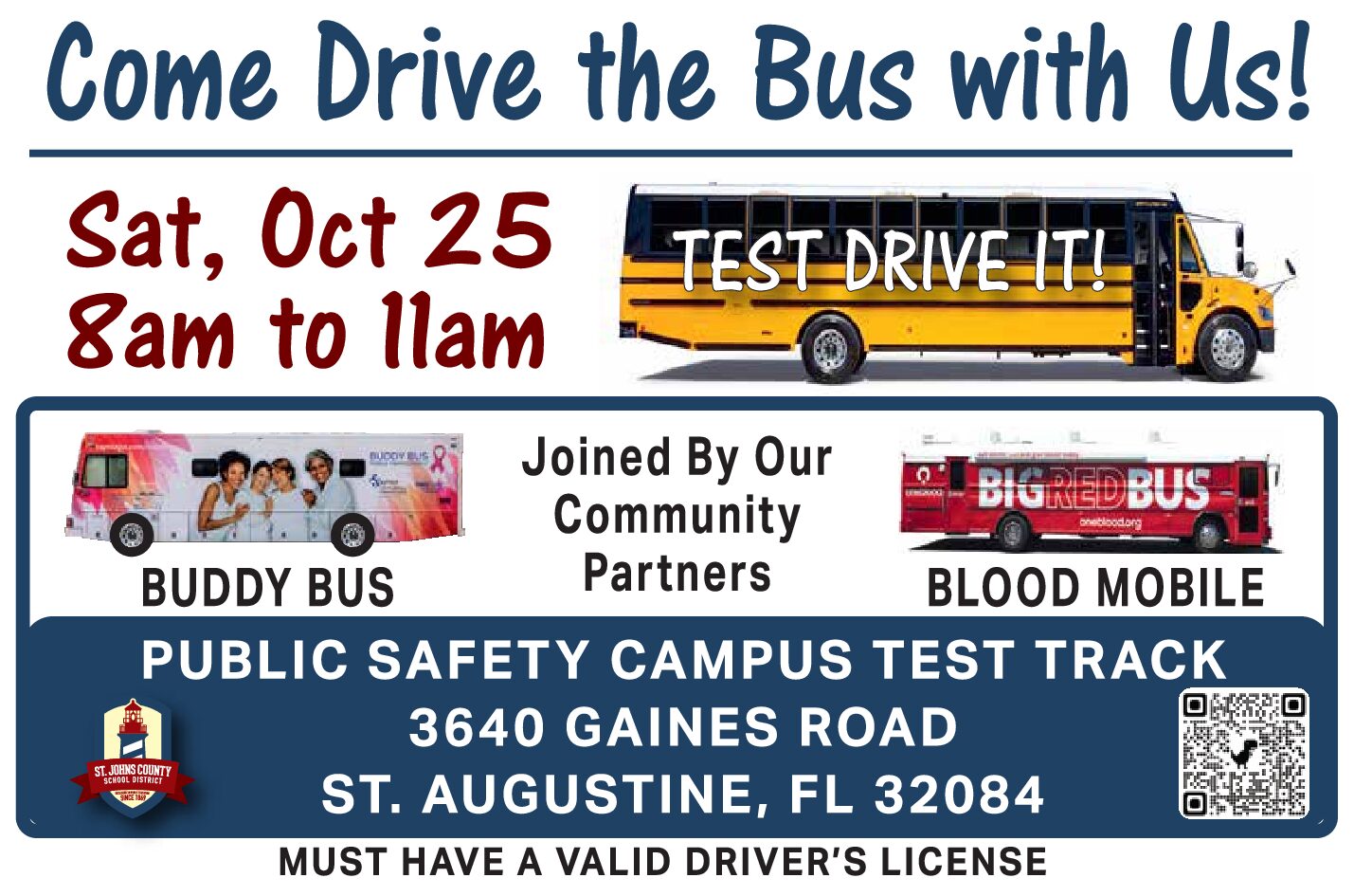 On Saturday, October 25, from 8am to 11am, the St. Johns County School District Transportation Department will be hosting a unique recruitment event called “Come Drive the Bus with Us” at First Coast Technical College’s Public Safety Campus located at 3640 Gaines Road in St Augustine. This is more than an open house for interested bus drivers, but an opportunity to drive it before you apply for it!