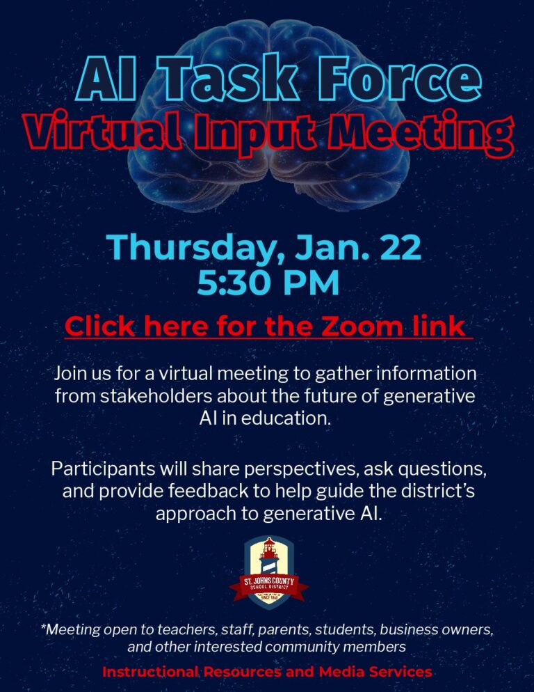 Join us on Thursday, January 22 at 5:30 p.m. for a virtual meeting to gather information from stakeholders about the future of generative AI in education. Participants will share perspectives, ask questions, and provide feedback to help guide the district’s approach to generative AI.
