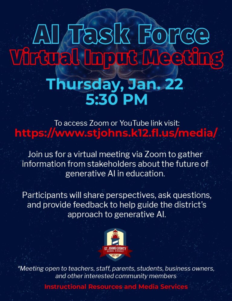 Join us on Thursday, January 22 at 5:30 p.m. for a virtual meeting to gather information from stakeholders about the future of generative AI in education. Participants will share perspectives, ask questions, and provide feedback to help guide the district’s approach to generative AI.