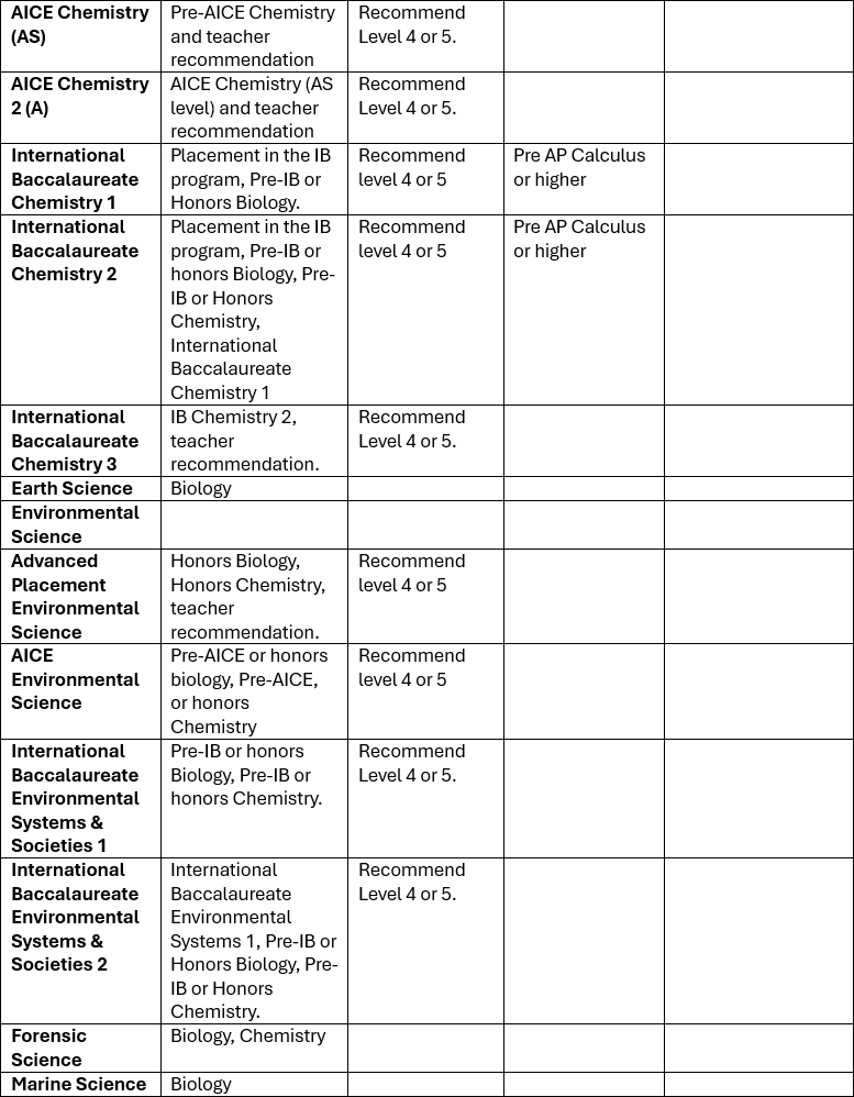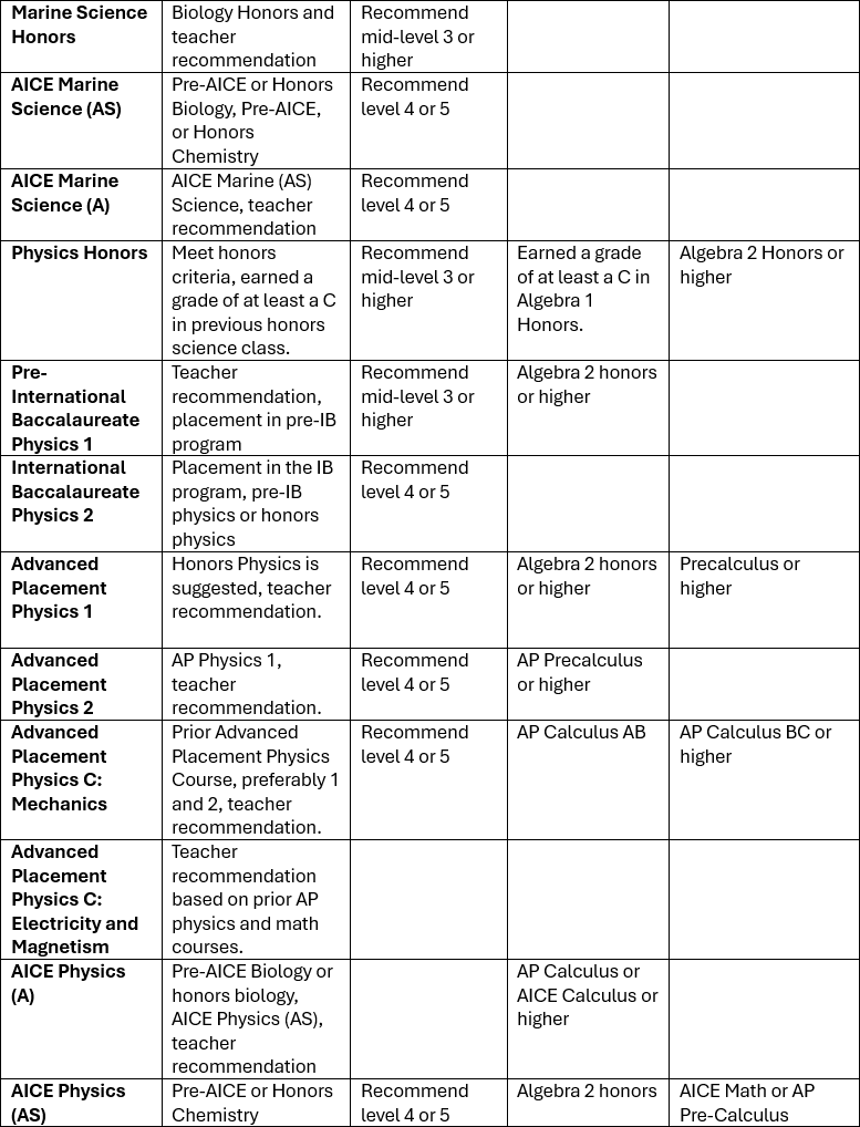 For Honors or Advanced Course Placement: Grade “C” or better in previous honors course, grade “A” in the previous standard course with teacher recommendation, SSA Level 4 or 5 but not less than 3 in any area.