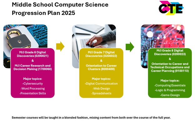 Depending on course availability and student needs, some schools may offer a slightly different progression in this area (either through alternate courses or digital tools earned). Additionally, digital tools may be offered in STEM, digital art, and core classes at some schools.